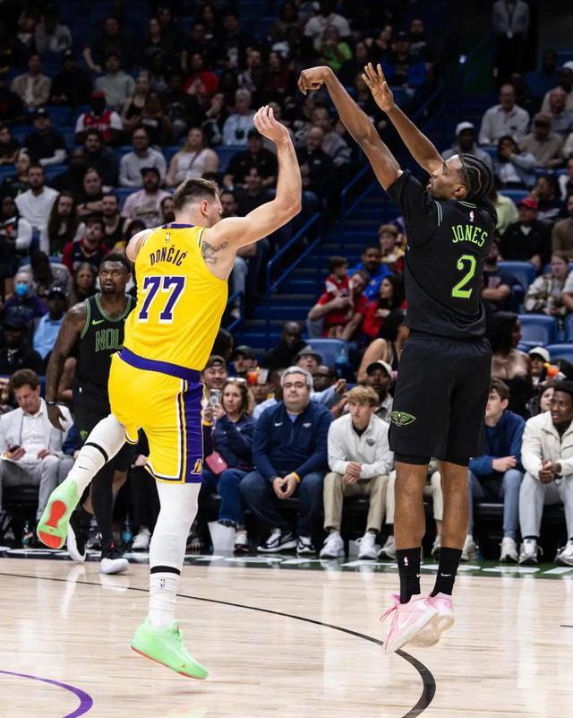 上一场比赛对阵灰熊,东契奇关键时刻连中两记三分杀死悬念。今天的比赛几乎是一模一样,又是东契奇连续两个三分终结比赛,只不过今天这两个三分要更夸张。一个是被逼到底角投出的接锅三分,一个又是24秒即将到时,在詹姆斯掩护下投出的超远漂移三分。