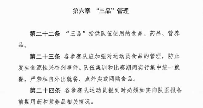 细则中第六章第二十三条明确指出,各参赛队应加强对运动员食品的管理,防止发生食源性兴奋剂事件。队伍集训和比赛期间实现集中统一就餐,严禁私自外出就餐、点外卖和网购食品。